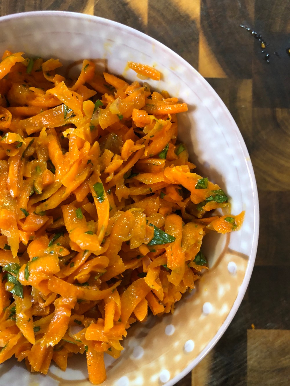 Pour over the carrots, fresh parsley and shallots. Toss to coat well. Taste and adjust for seasoning if necessary. Cover and refrigerate until ready to serve.